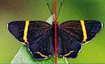 Un ejemplo más inmediato de simetría en el mundo orgánico es la mariposa, cuyas alas poseen simetría axial bilateral, en la que el eje es el cuerpo del insecto. Sus dibujos están dispuestos simétricamente respecto al eje. Esta regularidad constituye, a nivel de percepción, un factor estético de armonía.